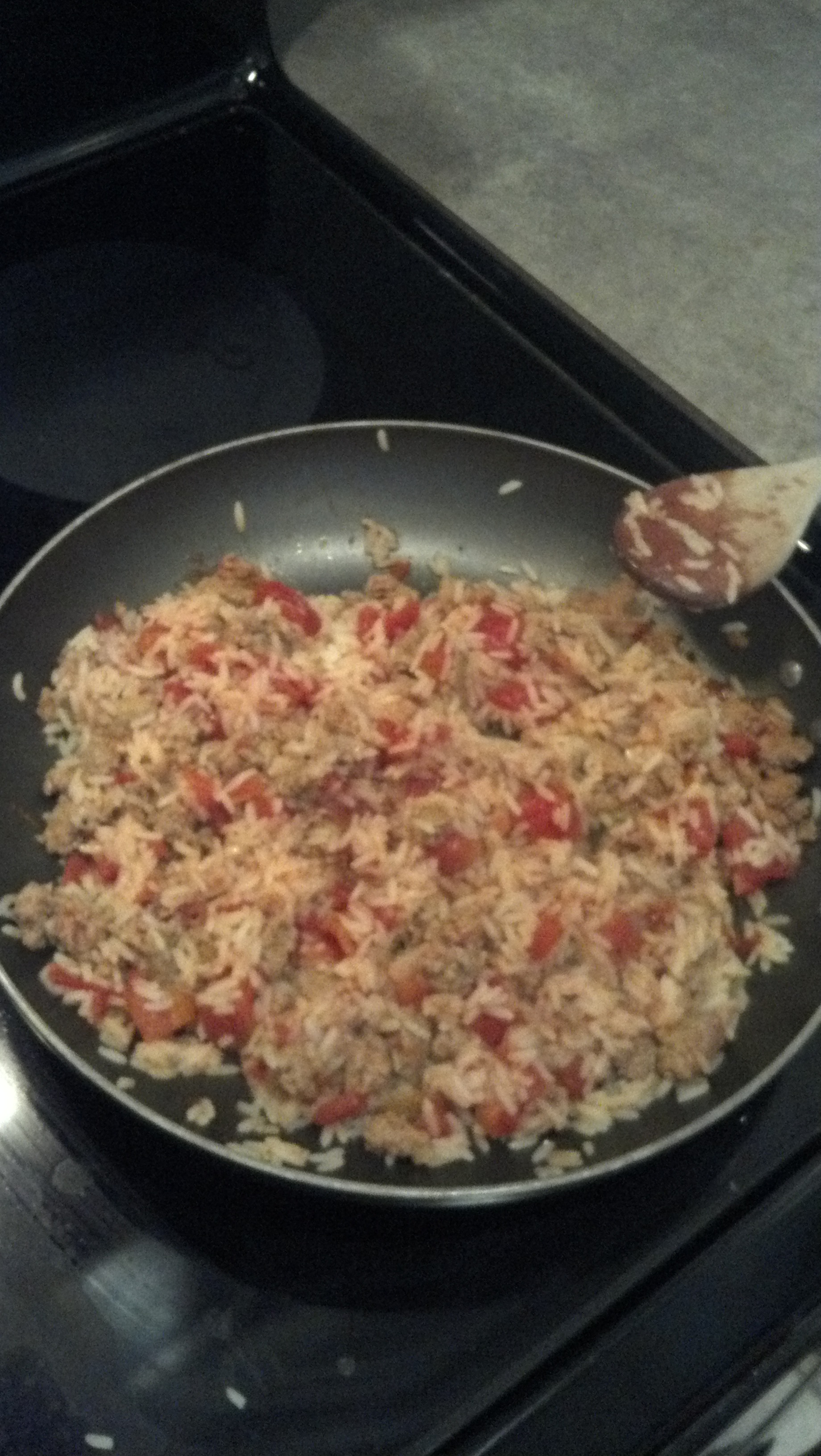 Cook the rice according to package instructions. Brown the sausage, then add 1/2 of the can of tomatoes and the cooked rice and stir it all together.