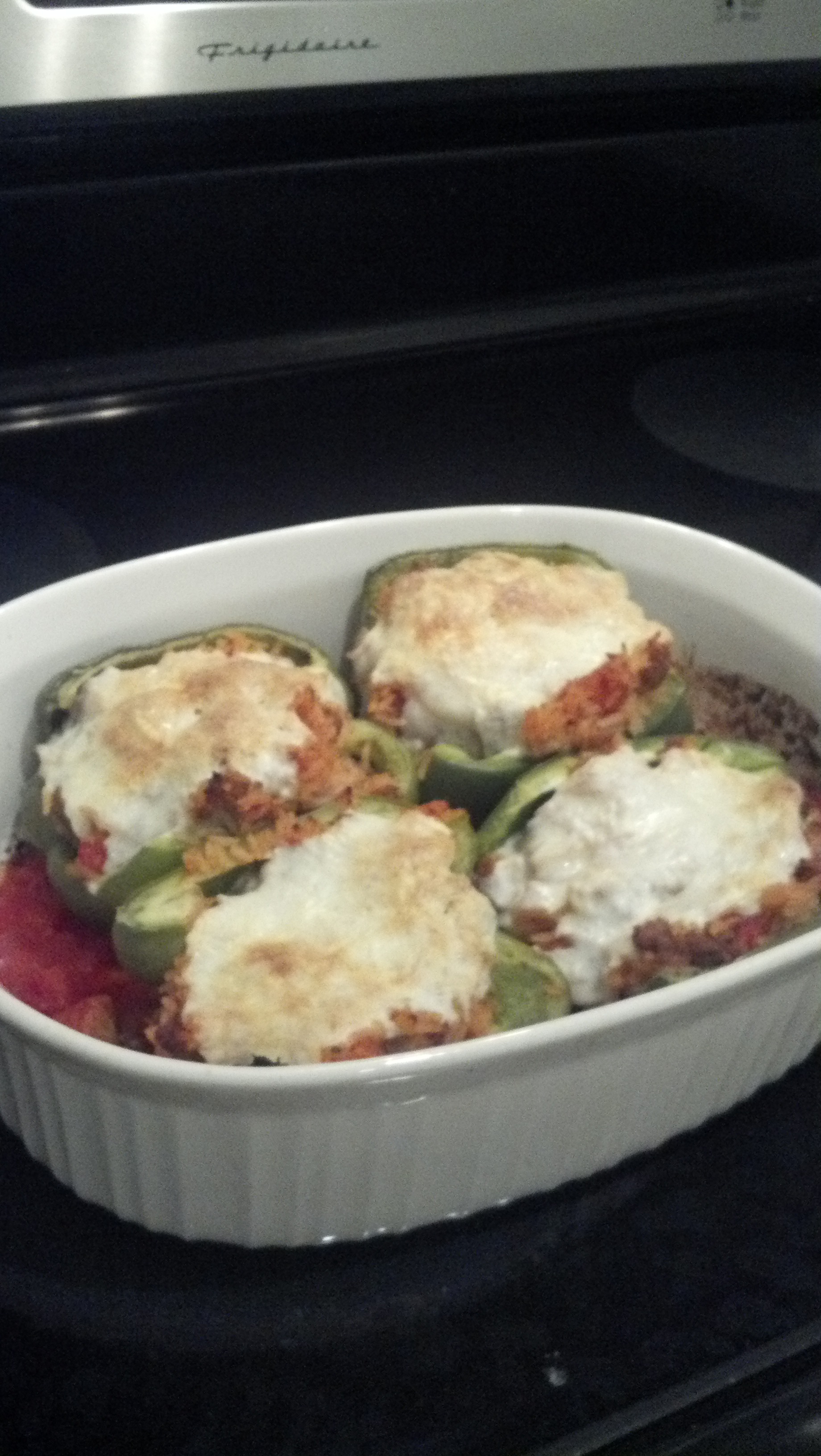 Spoon the sausage mixture into the pepper halves. Add the cheese on top. Pour the remaining 1/2 can of tomatoes into the bottom of the pan around the peppers.